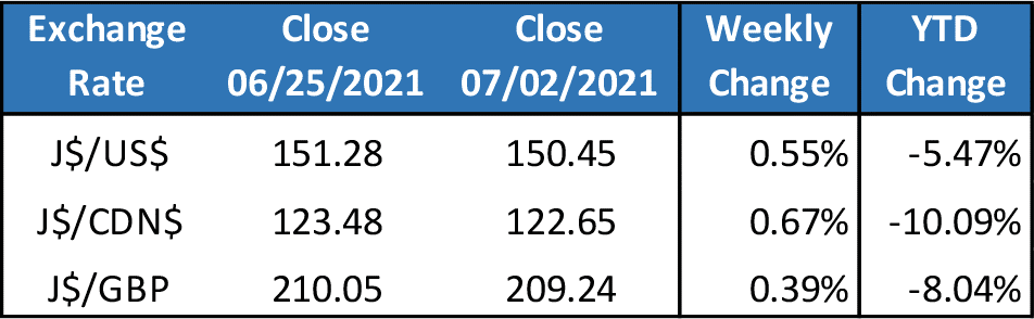 The Jamaican dollar appreciated by $0.83 relative to the US dollar week-over-week, moving from a selling rate of $151.28 on Friday, June 25th to $150.45 on Friday, July 02nd. The closing BOJ weighted average selling rates are as follows:
