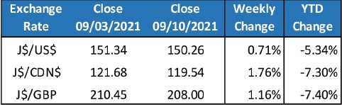 The Jamaican dollar appreciated by $1.08 relative to the US dollar week-over-week, moving from a selling rate of $151.34 on Friday, September 3rd to $150.26 on Friday, September 10th. The closing BOJ weighted average selling rates are as follows: