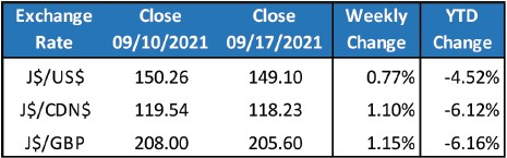 The Jamaican dollar appreciated by $1.15 relative to the US dollar week-over-week, moving from a selling rate of $150.26 on Friday, September 10th to $149.10 on Friday, September 17th.The closing BOJ weighted average selling rates are as follows:
